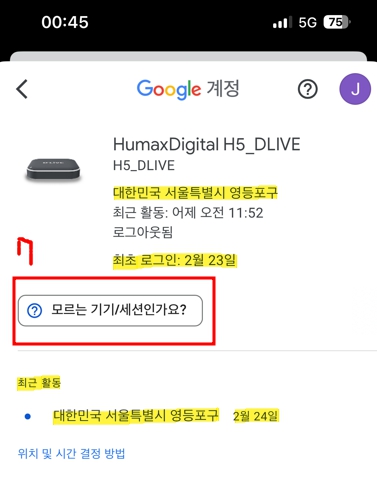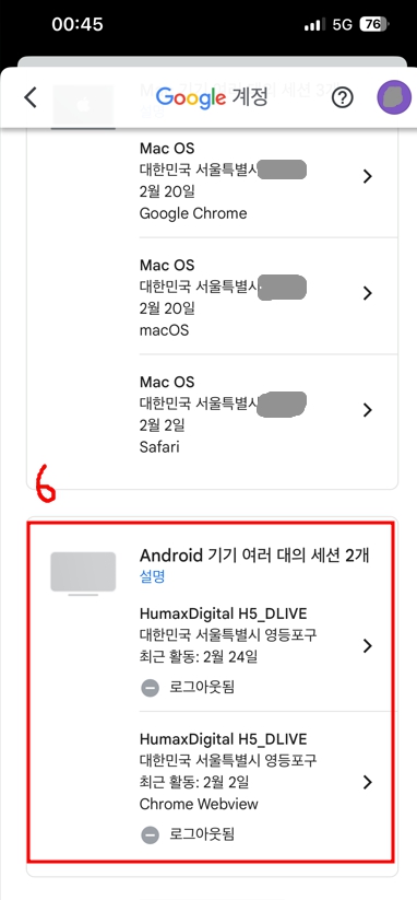 - 다른 기기에 로그인했던 장소 및 날짜 확인하여 클릭 후 로그아웃하기