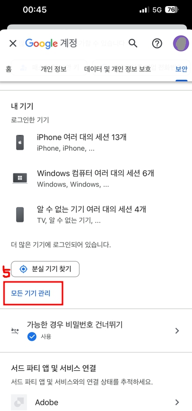 - '보안' 탭 클릭하고 아래로 내려가서 '모든 기기 관리' 클릭