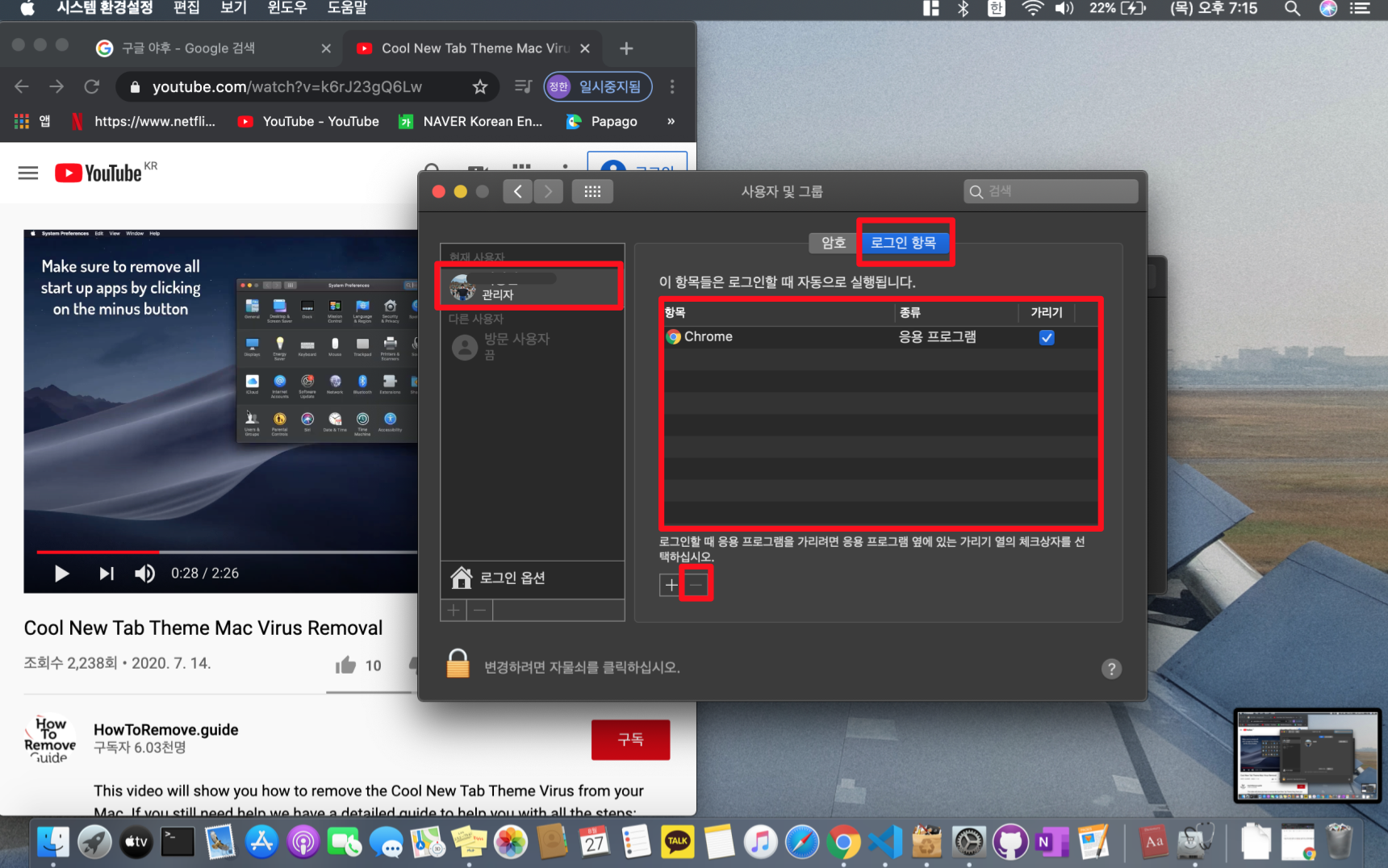 시스템 환경설정 -> 사용자 및 그룹 -> 관리자 선택 -> 로그인 항목 클릭!