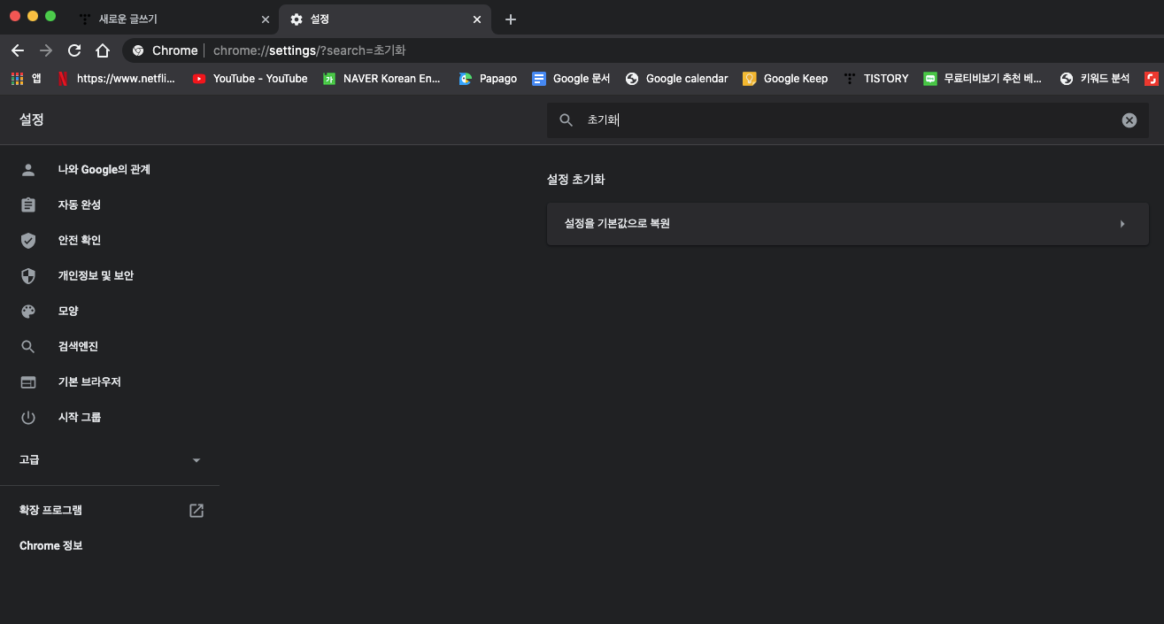크롬에서 '설정'으로 가시면 맨 위에 검색 창이 있을 겁니다. 검색 창에서 '초기화'를 입력하면 '설정을 기본값으로 복원'이라는 목록이 밑에 나오게 됩니다. 이것을 클릭하시면 하시면 됩니다