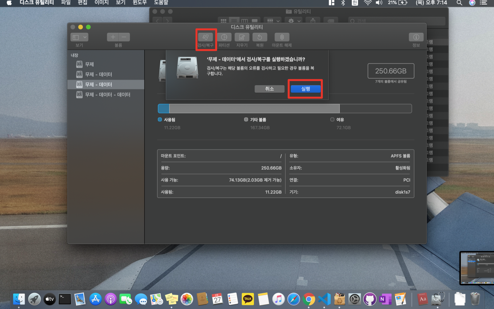 왼쪽에 보이는 무제 및 무제 데이터 4가지 모두를 하는 것이 아니고 처음에 디스크 유틸리티를 클릭하고 자동으로 선택된 디스크 1개만 검사/복구를 실행하시면 됩니다.
