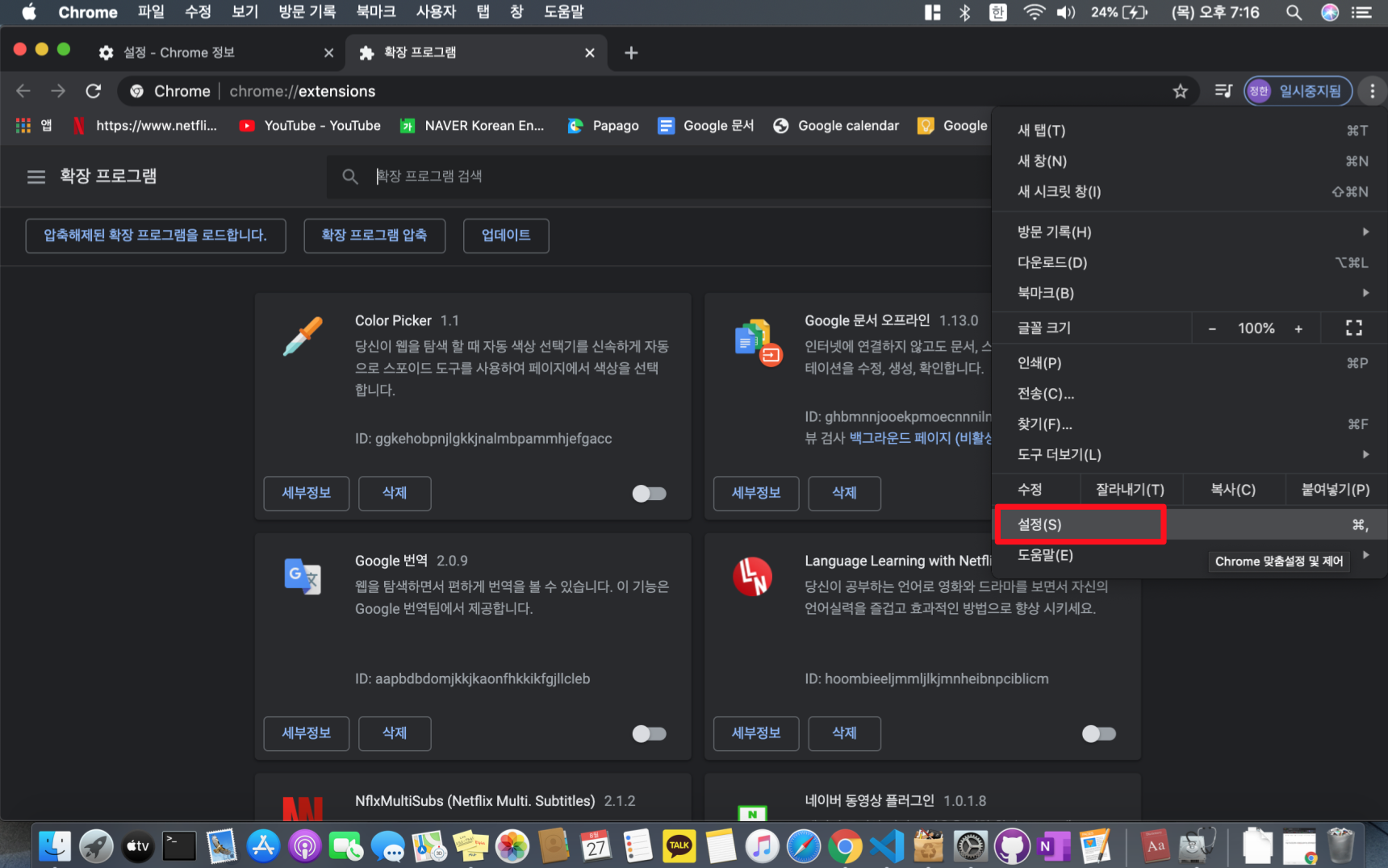 확장 프로그램으로 가서 평소에 보지 못했던 또는 익숙하지 않은 확장 프로그램들을 모두 삭제해 주시기 바랍니다. 헷갈리신다면 모두 삭제해 주시고 나중에 다시 다운로드하는 것을 추천드립니다.