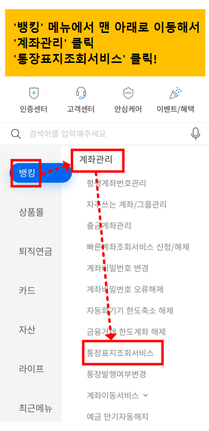 - '뱅킹' -> '계좌관리'(맨밑에 있음) -> '통장표지조회서비스'를 클릭한다.