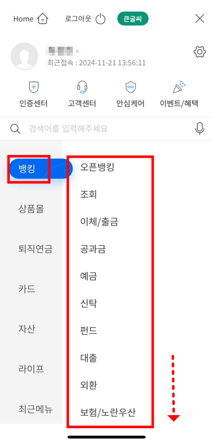 '뱅킹' 메뉴에서 '계좌관리'를 찾아야합니다. 위 사진에서는 안보이는데 맨 아래에 '계좌관리' 가 있습니다.