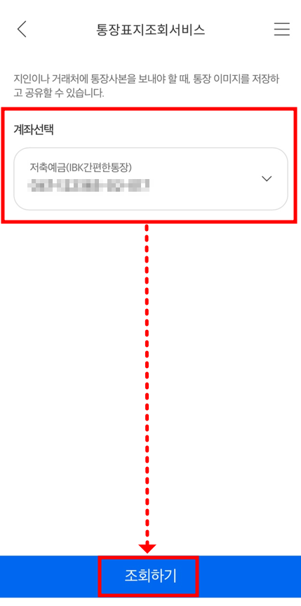 - 통장사본을 확인하고자 하는 계좌 선택 후 맨 아래 '조회하기'를 클릭한다.