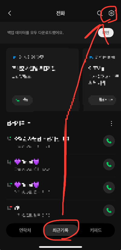 1. 에이닷 앱 실행 → ‘전화’ 탭 → '최근 기록' 탭 → 오른쪽 상단 설정(톱니바퀴) 클릭!