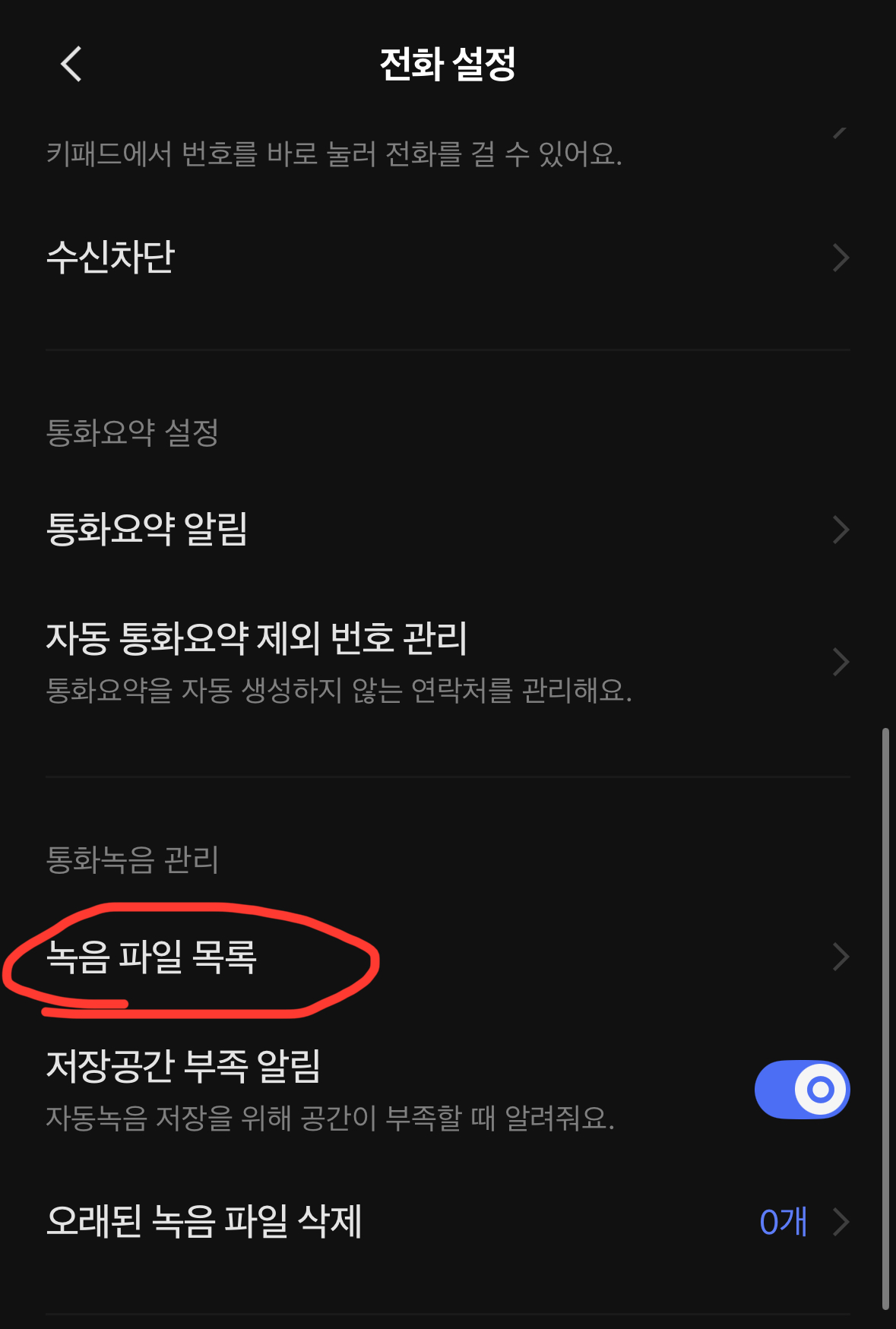 2. 화면에서 아래로 내려가서 위 사진처럼 '녹음 파일 목록'을 클릭해줍니다.