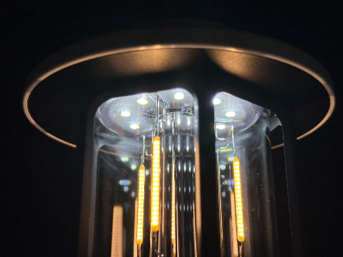 위 사진은 검정색 동그라미 부분은 스위치 입니다. 왼쪽으로 돌리면 조명이 켜지고 계속 돌리면 단계별로 다른 밝기와 색상으로 전환되는 것을 알 수 있습니다. (아래 사진을 참고하시기 바랍니다.)