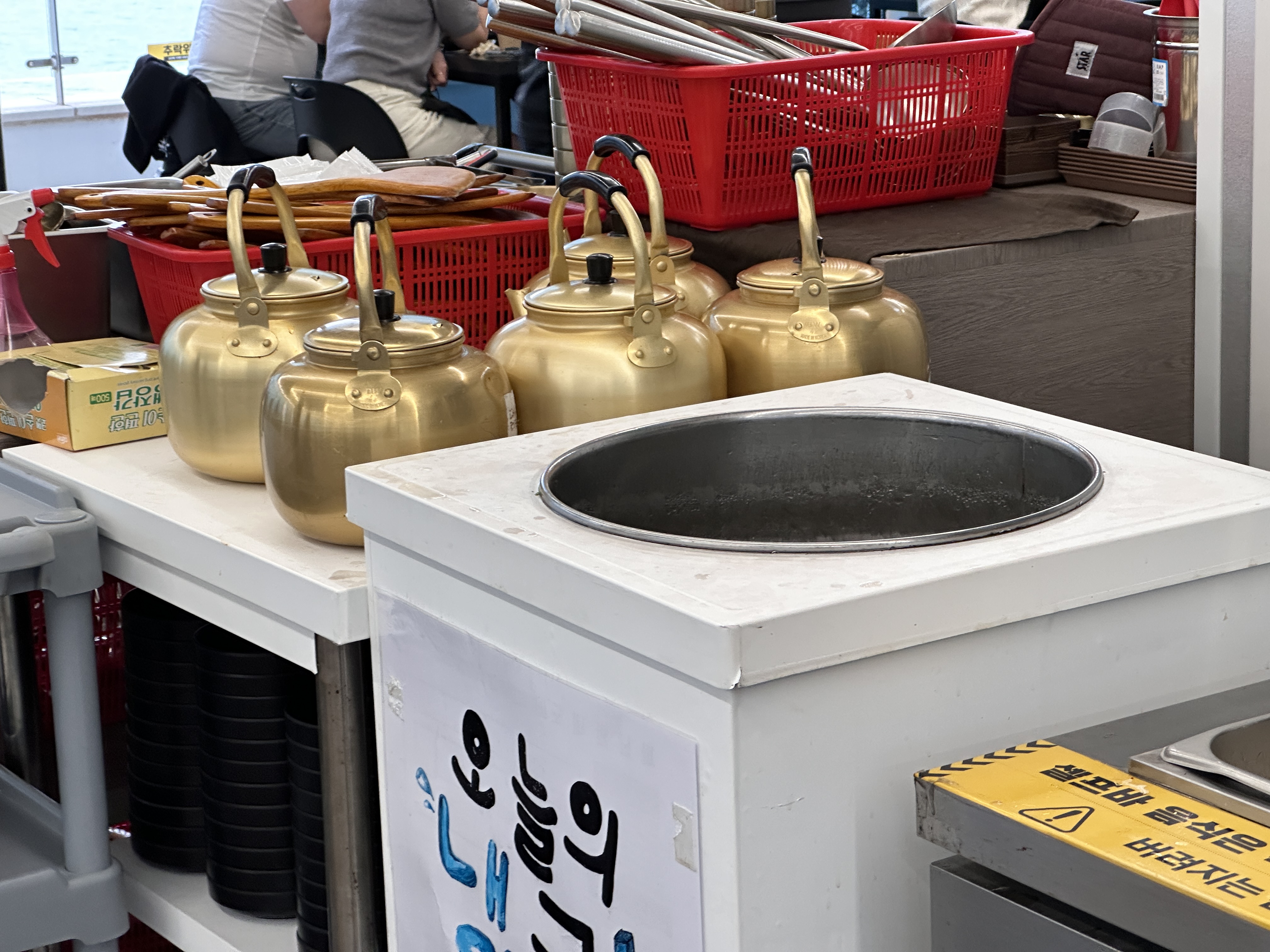 사진에서 보이는 주전자는 닭볶음탕에 들어가는 육수입니다. 식사를 하시다가 육수가 더 필요하시다면 편하게 가져가 육수를 더 넣으시면 됩니다.