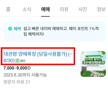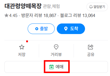 네이버지도를 통해서 예매를 했습니다. 아래 네이버지도에서 '대관령양떼목장'이라고 검색 후 대관령양떼목장 제목을 클릭해주세요