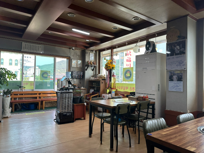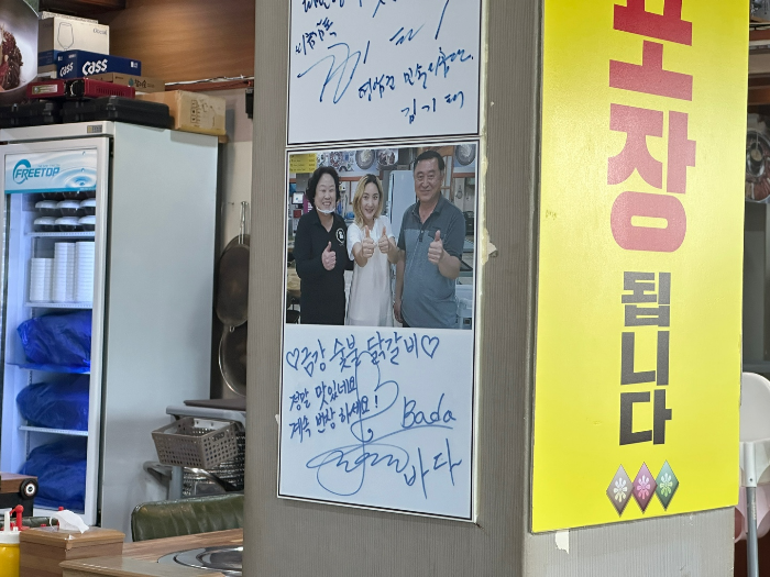닭갈비가 먹고 싶어서 유명하다고 하는 금강숯불닭갈비 메밀막국수 맛집을 방문했습니다. 위 사진(왼쪽 사진)을 보면 연예인 가수 바다씨의 사진이 보였습니다. 오른쪽 사진은 입구와 테이블 사진입니다.