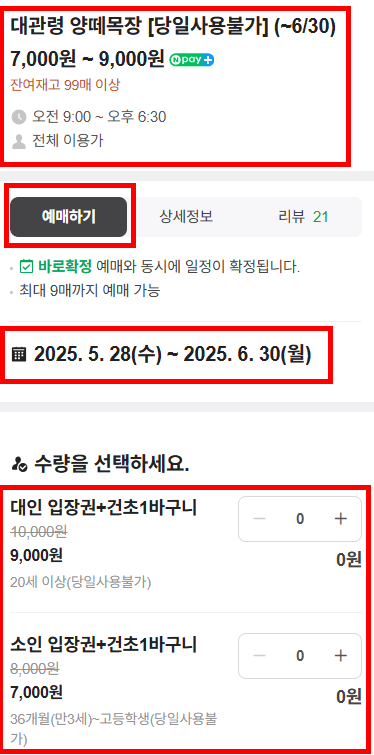 위 사진처럼 예매(왼쪽 사진) 버튼을 누르면 '대관령 양떼목장[당일사용불가](~6/30)'라고 적혀진 파란색 글씨를 클릭해주세요 (가격은 7000~9000원) '~6/30'의 의미는 구매후 구매한 날짜 다음 날부터 6/30까지 방문하면 언제든지 사용가능 하다는 의미입니다. 아래 사진에서 이어가도록 하겠습니다.