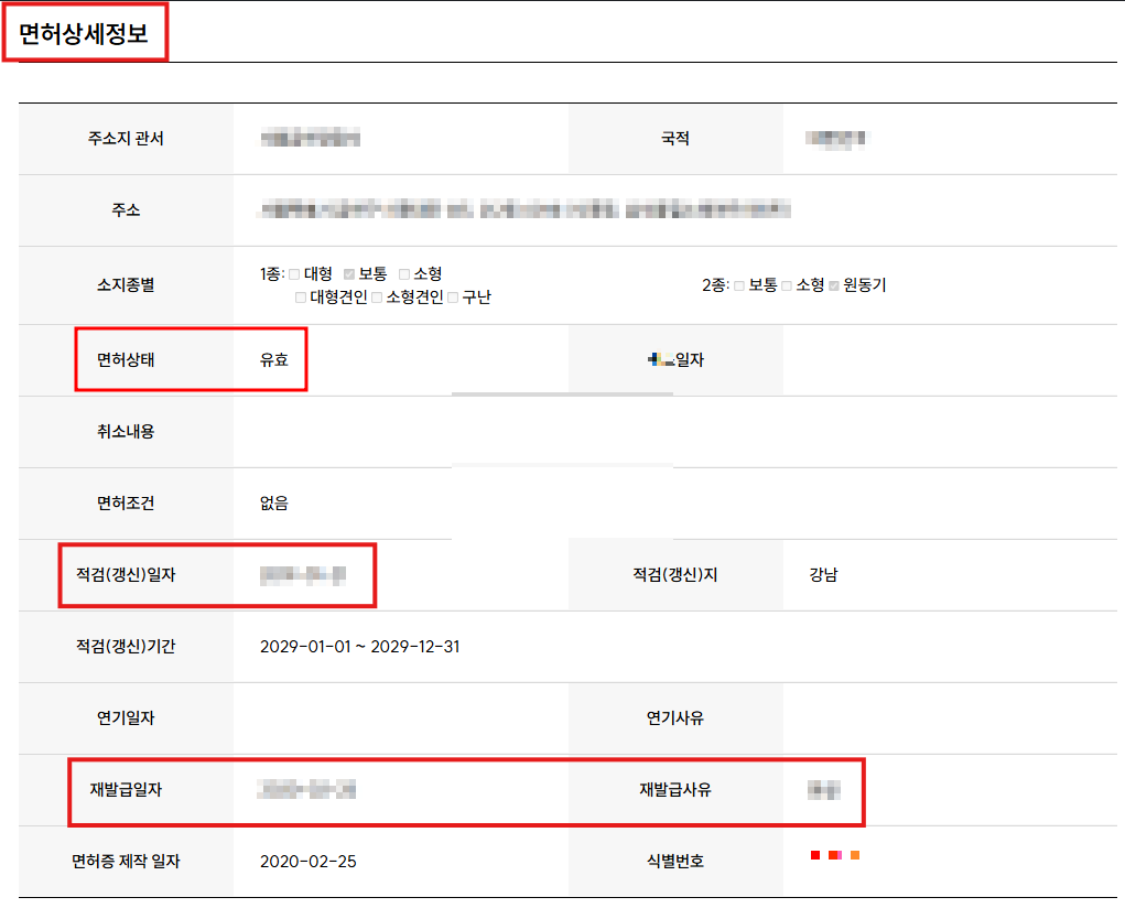 면허상태도 확인할 수 있으며 적검(갱신)일자는 바로 갱신일자를 말하는 것입니다. 갱신을 하게되면 원래는 갱신일자가 운전면허증에 새로 표시되는데 저는 중간에 분실을 하게되면서 재발급을 받았습니다. 따라서 제 운전면허증에는 갱신일자가 아닌 재발급일자가 표시되어 있습니다. 참고하시기 바랍니다.