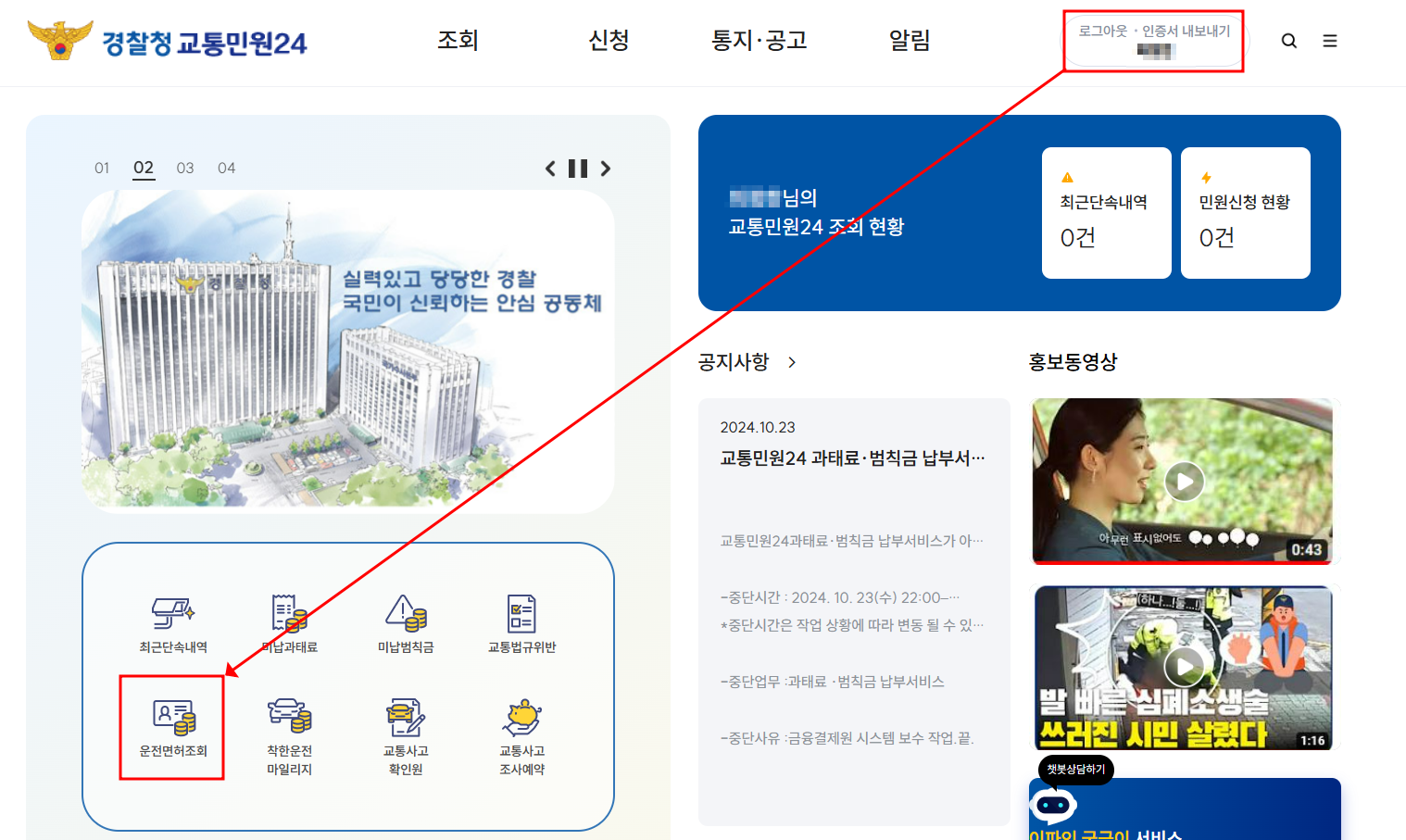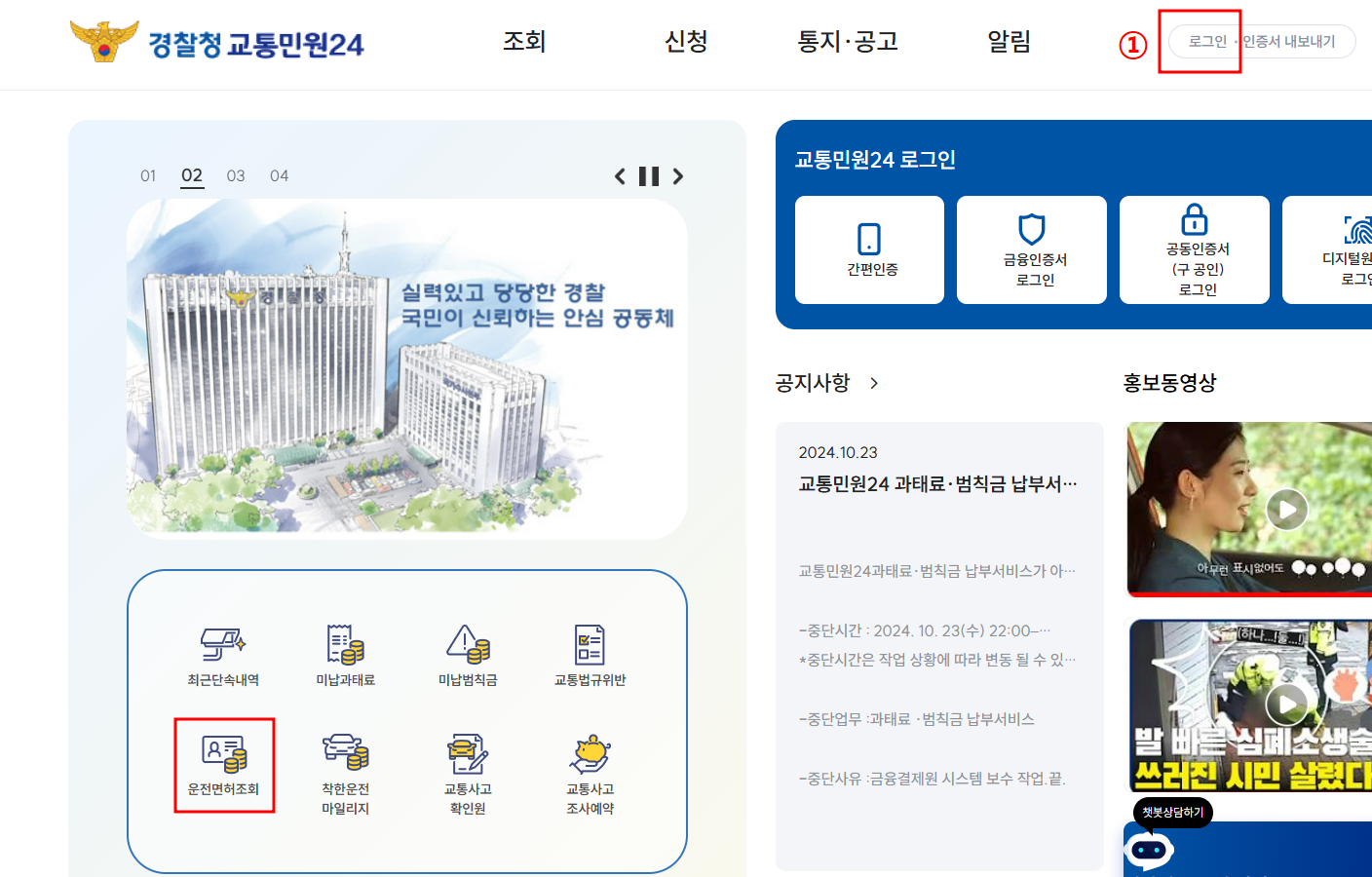 왼쪽 밑에 운전면허조회를 하는 곳이 있지만 먼저 로그인을 해야합니다. 오른쪽 위에 ① 로그인을 먼저 클릭합니다.