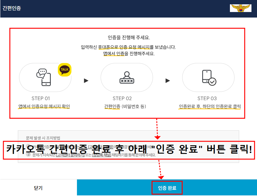 다시 PC 화면으로 돌아가서 "인증 완료" 버튼을 눌러주시기 바랍니다.