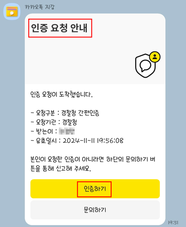 전 단계에서 "인증요청"을 클릭하면 위와 같은 화면이 나옵니다. 그럼 바로 핸드폰을 확인하여 카카오톡으로 이동해주시기 바랍니다.