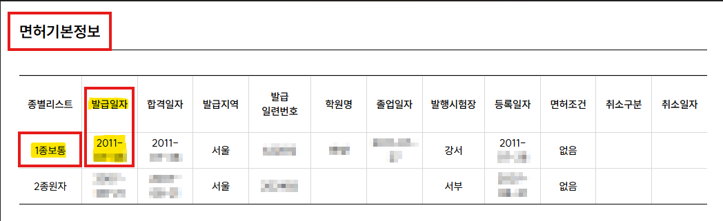 맨 아래로 내려가시면 바로 여기에서 면허증별로 취득일자(발급일자)를 확인할 수 있습니다. 또한 운전면허 합격일자도 확인이 가능합니다. 따라서 한 번 갱신을 한 경우라면 운저면허 최초 발급일자(취득일자)를 자신이 가지고 있는 운전면허증에서 확인을 할 수가 없습니다. 방법은 경찰청교통민원24(이파인) 홈페이지를 통해서 운전면허 조회를 직접해야 확인이 가능합니다.