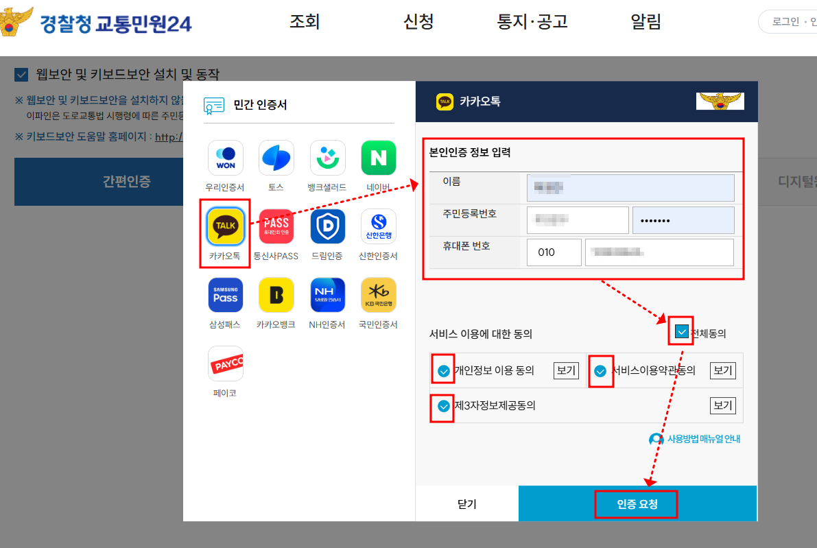 - 왼쪽에서 카카오톡 아이콘 클릭 → 오른쪽에서 필요 정보(이름,주민등록번호 등등) 모두 입력 → 아래 전체동의 체크 → 맨 아래 "인증요청" 클릭