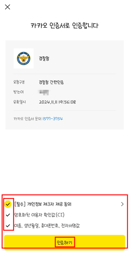 - 핸드폰에서 카카오톡 접속 → "카카오톡 지갑"에서 온 메시지 확인 → "인증하기" 클릭 → 전체동의 체크 후 "인증하기" 클릭