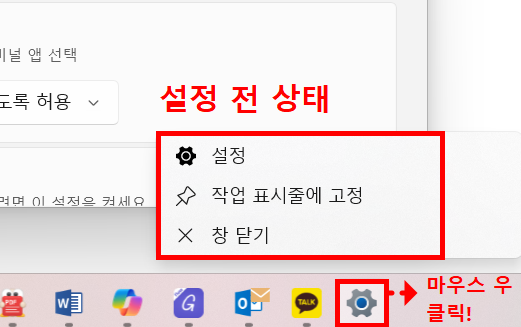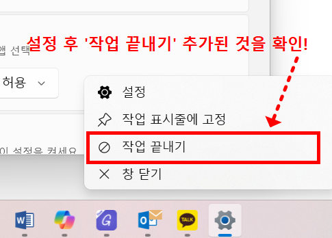 설정 전에는 '작업 끝내기'라는 항목이 나오지 않았지만 설정 후에는 '작업 끝내기' 항목이 추가되었습니다. 이제는 작업표시줄에서 마우스 우 클릭 후 '작업 끝내기'를 누르면 쉽게 강제 종료를 할 수 있습니다.