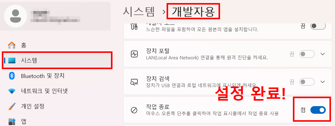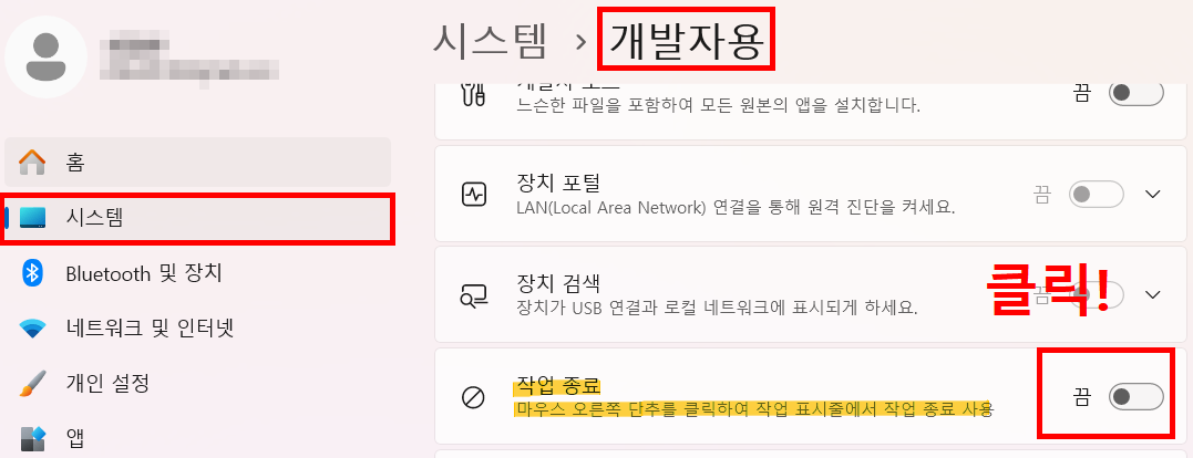 개발자용 메뉴에 들어오셔서 '작업 종료' 마우스 오른쪽 단추를 클릭하여 작업 표시줄에서 작업 종료 사용 문구 오른쪽에 '끔' 이라고 쓰여진 글자 오른쪽 타원형 동그라미를 클릭해주시기 바랍니다.