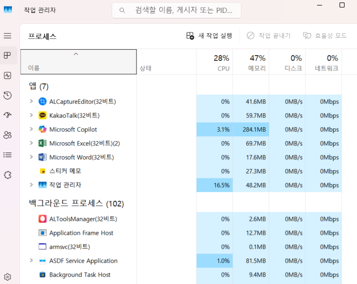 이전에는 [Ctrl + Alt + Delete → 작업 관리자 클릭 → 프로그램 선택 → 작업끝내기] 와 같은 과정에서 작업 관리자 창(사진)이 뜬 뒤에 강제 종료를 해야하는 프로그램을 찾아서 마우스 우 클릭 후 작업 끝내기를 해야했지만 오늘 소개한 간단하게 작업 끝내기를 할 수 있는 설정을 하고 나면 [마우스 우 클릭 → 작업 끝내기] 2단계만으로 프로그램을 강제 종료 할 수 있습니다.
