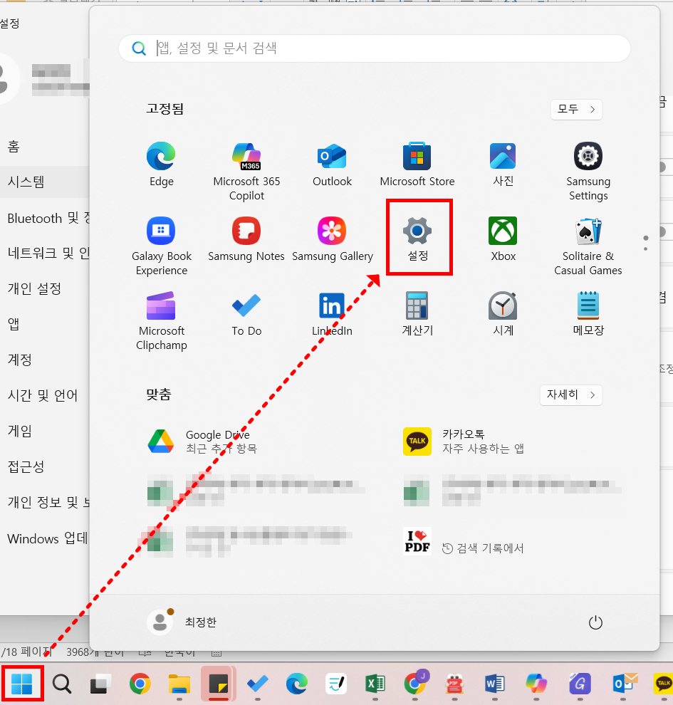 먼저 위 사진에서 왼쪽 하단의 '시작' 버튼을 누루고 ' 설정'으로 들어가주시기 바랍니다.