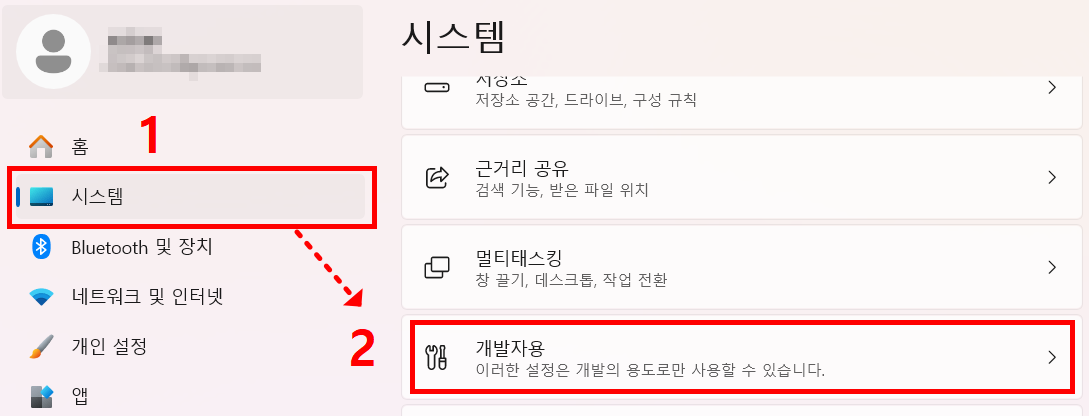 먼저 키보드 위 사진에서 보이는 것처럼 빨간색 숫자 1번' '시스템' 클릭 후 오른쪽 창에서 아래로 스크롤하면 2번 '개발자용'을 클릭하시기 바랍니다.