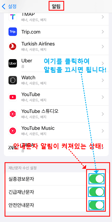 아이폰 '설정' → '알림' → 맨 아래로 이동 → '재난문자 수신 설정' 메뉴에서 알림 설정 및 해제하기