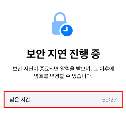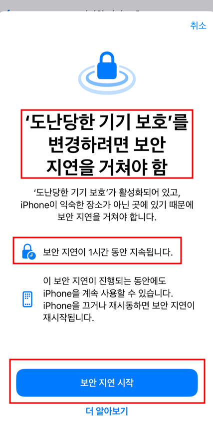 '도난당한 기기 보호'를 해제할 경우에도 '보안 지연 시작' 1시간을 거쳐서 해제 해야하니, 처음부터 이 설정을 해제하실 거라면 '도난당한 기기 보호' 해제를 위해 1시간을 먼저 할애한 뒤에 '암호 변경'을 보안 지연 시간의 과정 없이 바로 하시는 것이 좋습니다.