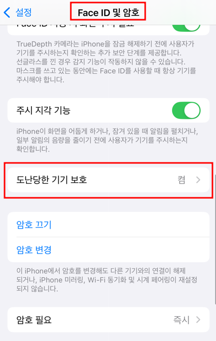 이와 같은 '보안 지연 시작' 과정 없이 '암호 변경'을 하기 위해서는 '도난당한 기기 보호'를 즉 해제 해야합니다.