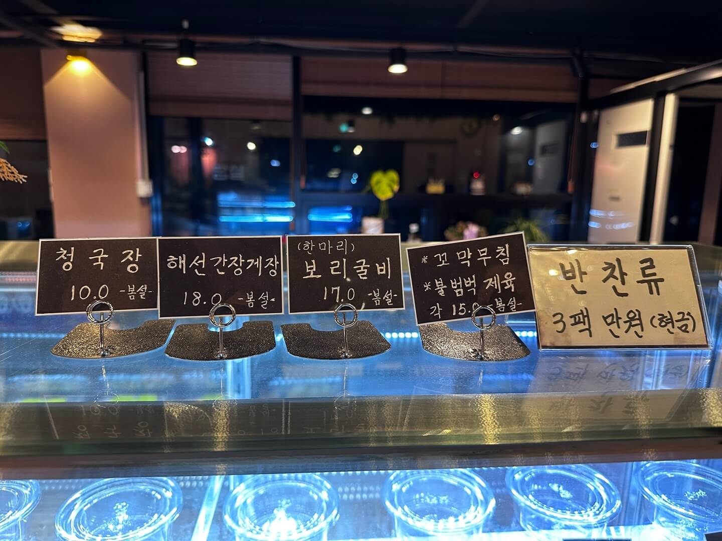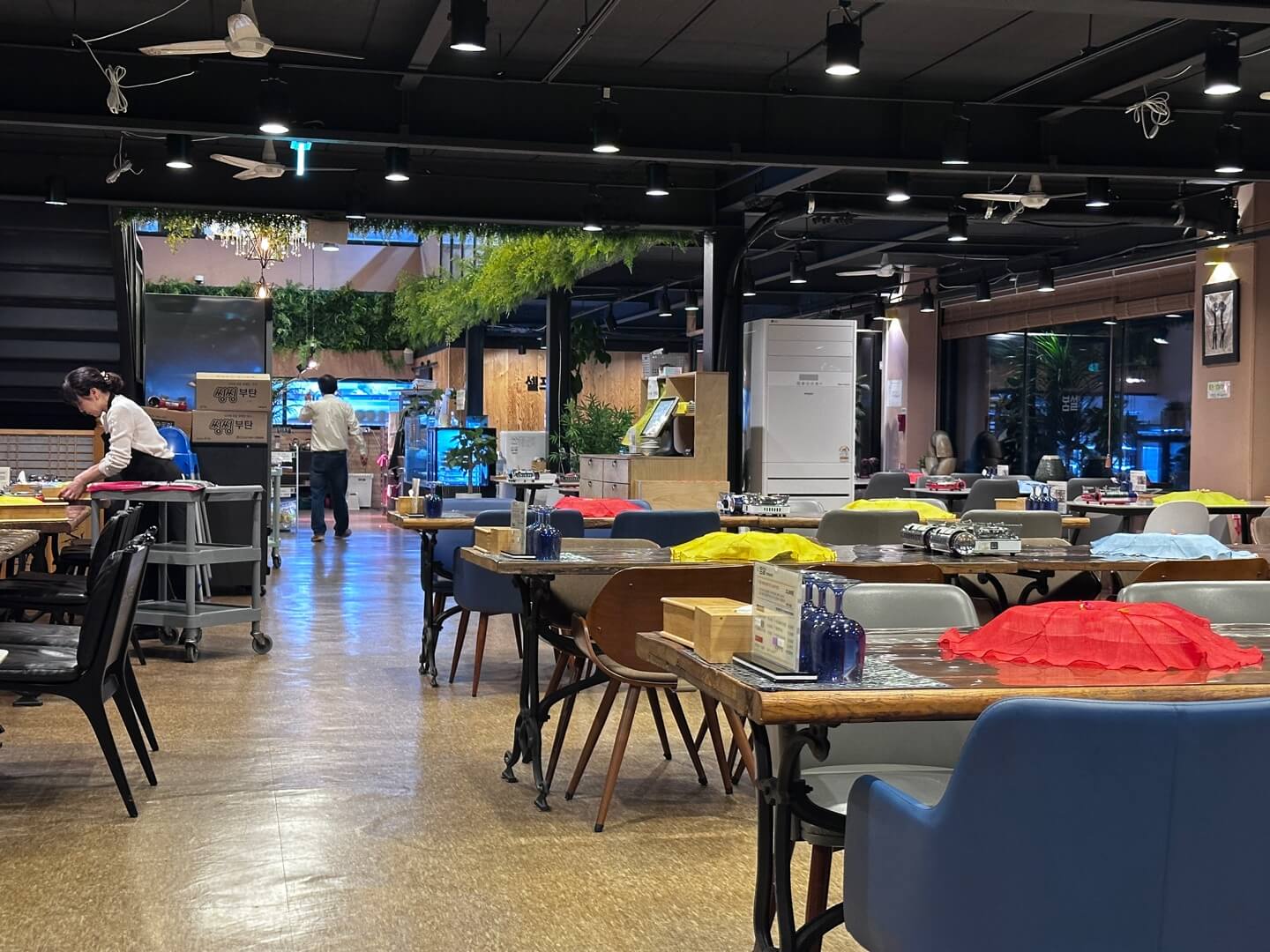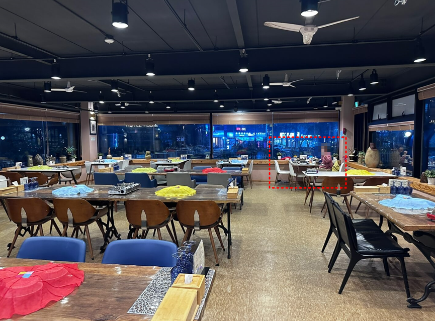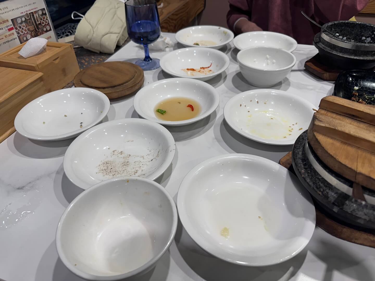 저희는 위 사진에 빨간색 박스로 체크되어 있는 창가쪽 구석에 앉아서 식사를 했습니다. 각 테이블마다 물겁과 수저 그리고 앞접시들이 있으면 앞접시들은 밥상보로 덮어져있습니다.
