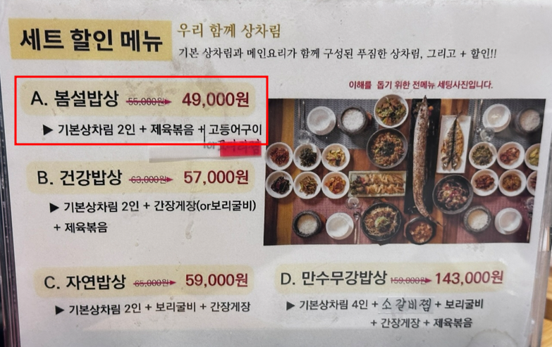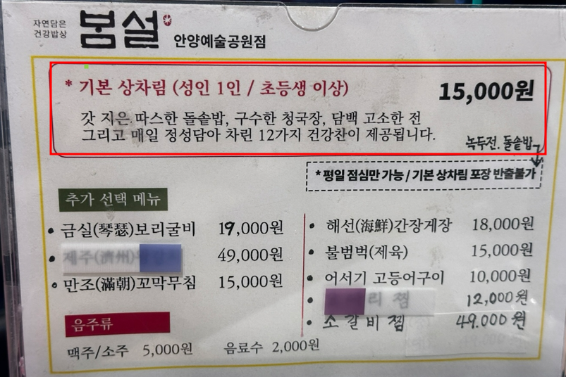 안양예술공원점 봄설에서 저희는 기본 상차림 (성인 1인 / 초등생 이상) 15,000원짜리 1인분과 세트메뉴인 A 세트 봄설밥상 49,000원짜리를 시켰습니다. 총 3명에서 먹는 건데 이렇게 시켜도 충분하다고 해서 시켰습니다.