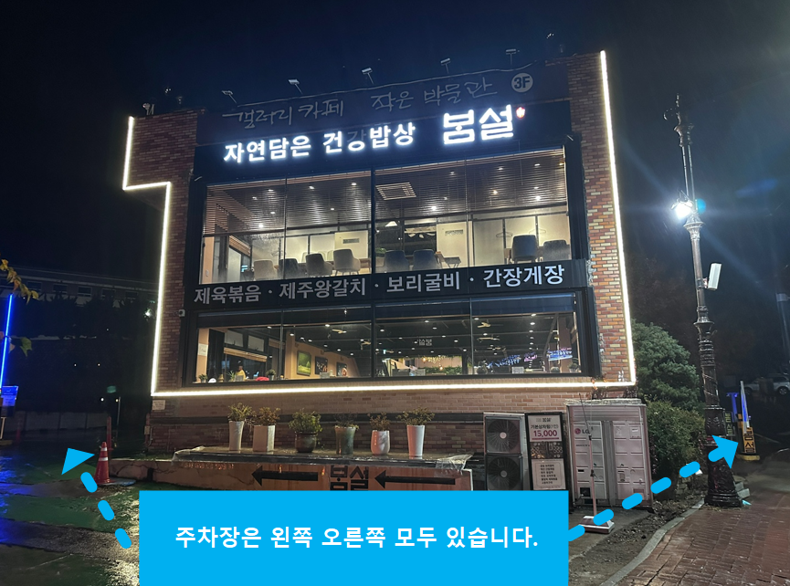 자연담은 건강밥상 '봄설'의 위치와 주차장 위치는 위 사진을 확인해주시기 바랍니다. 건물 왼쪽과 오른쪽 모두 주차 공간이 있으며 식당 입구 또한 양쪽에 모두 있습니다. 화장실은 건물 사진을 기준으로 왼쪽에 있습니다.