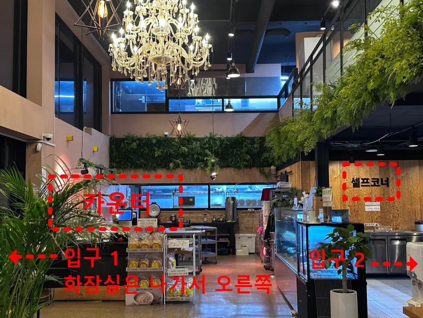 입구는 2개, 화장실은 왼쪽 입구로 나가서 오른쪽에 있습니다.