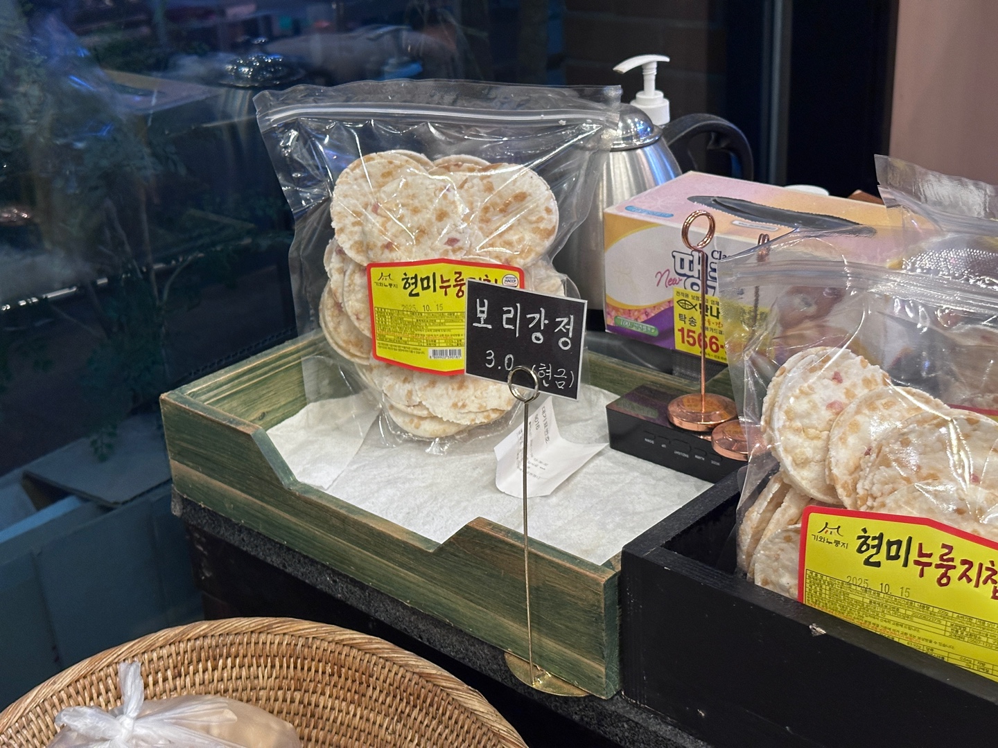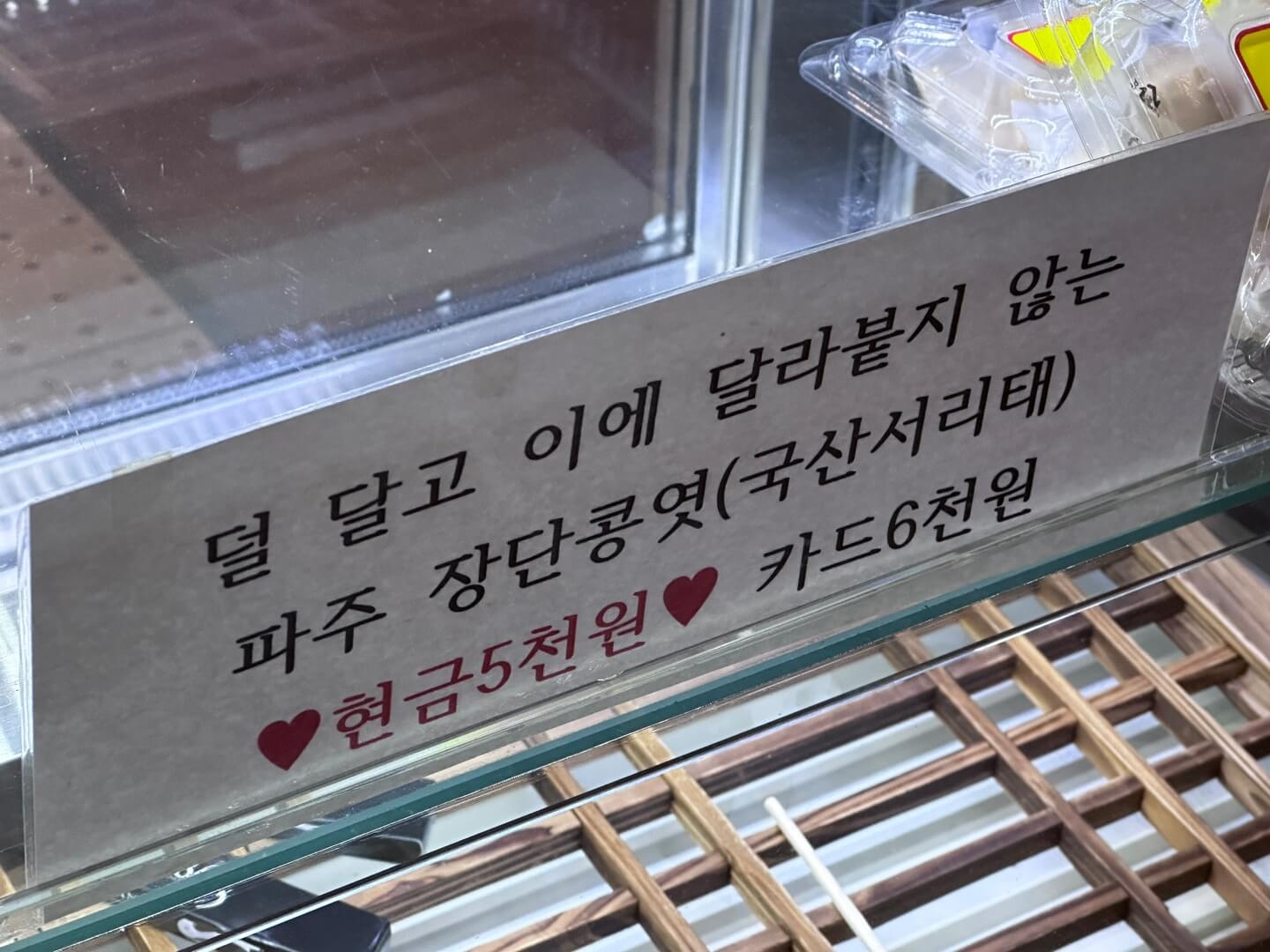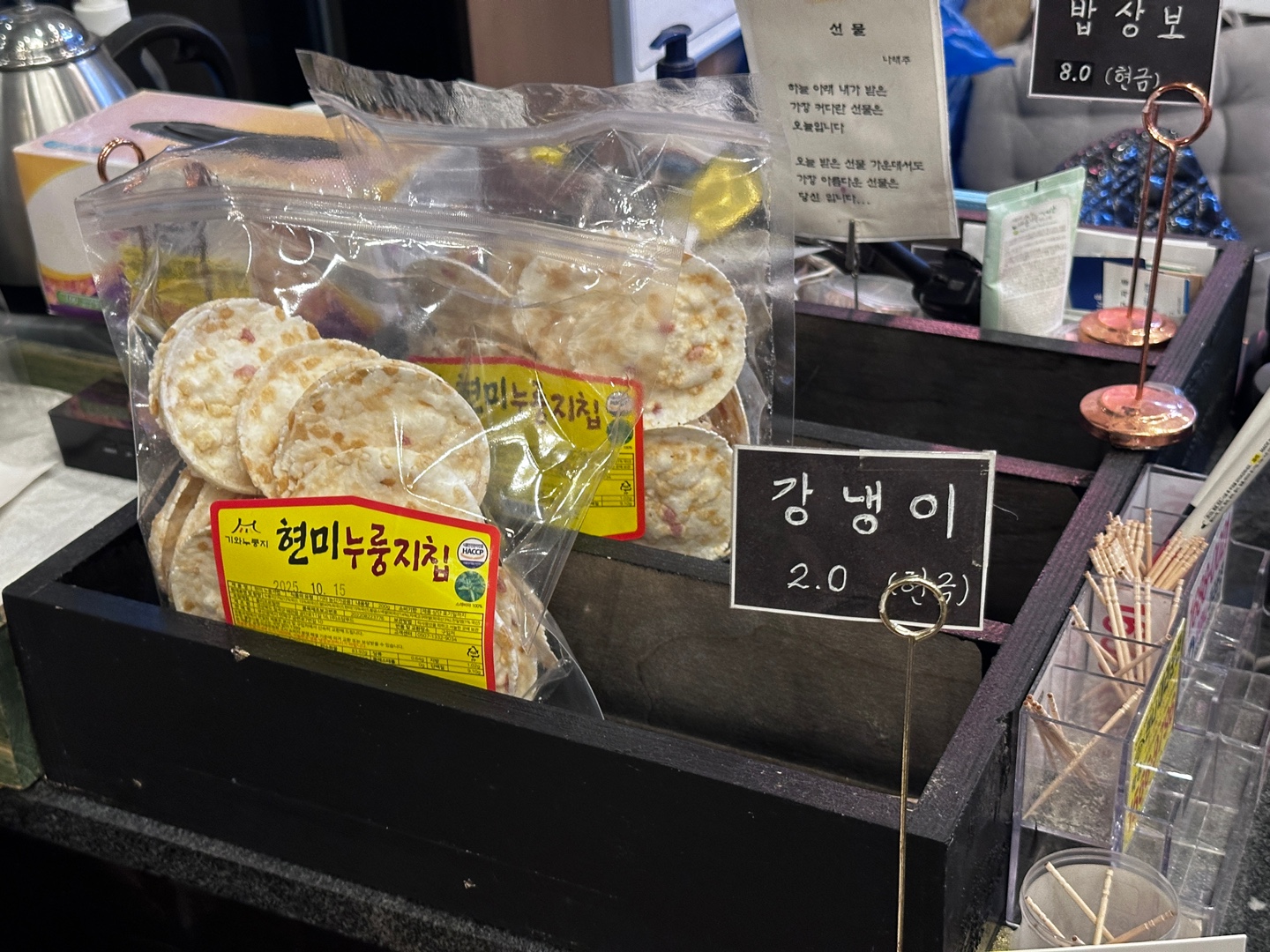 밥상보, 강냉이, 보리강정 등이 카운터 앞에 있었고 가격 옆에 '(현금)' 이라고 쓰여져있는 걸 보니 현금으로만 계산이 가능한 것 같습니다.