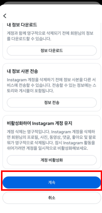 7. '계정 영구 삭제' 단계에서 아래로 내려가서 '계속'을 클릭합니다. 이 단계에서는 인스타그램 계정을 삭제하기 전에 자신의 정보와를 다운로드, 사본 전송을 할 수 있습니다.