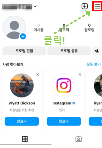 1. 인스타그램 로그인 후 위 사진을 보시면 오른쪽 상단 사각형 박스로 표시된 가로로 세줄로 된 모양을 클릭해주세요!