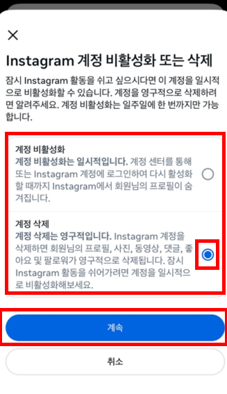 4. 'Instagram(인스타그램) 계정 비활성화 또는 삭제' 단계에서 위 사진과 같이 '계정 비활성화, 계정 삭제' 중 1가지 원하는 것을 선택하고 '계속'을 클릭해주세요! (여기서는 '계정 삭제'를 선택하여 진행하도록 하겠습니다.)