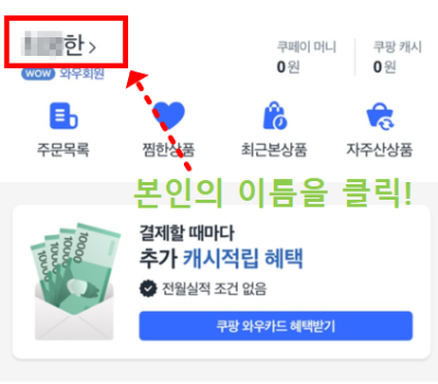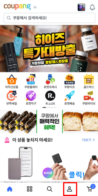 1. 위 사진은 쿠팡 접속 후에 화면입니다. 쿠팡 접속 후 맨 아래 사진에 보이는 빨간색 사각형 모양을 클릭해주세요!