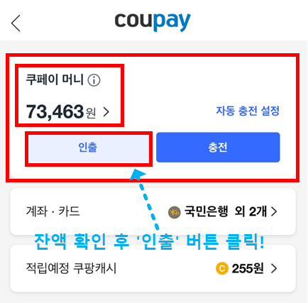 4. 위 사진에서 쿠페이 머니 잔액 확인 후 '인출' 버튼 클릭!