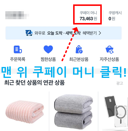 3. 화면 상단에 '쿠페이 머니' 클릭!