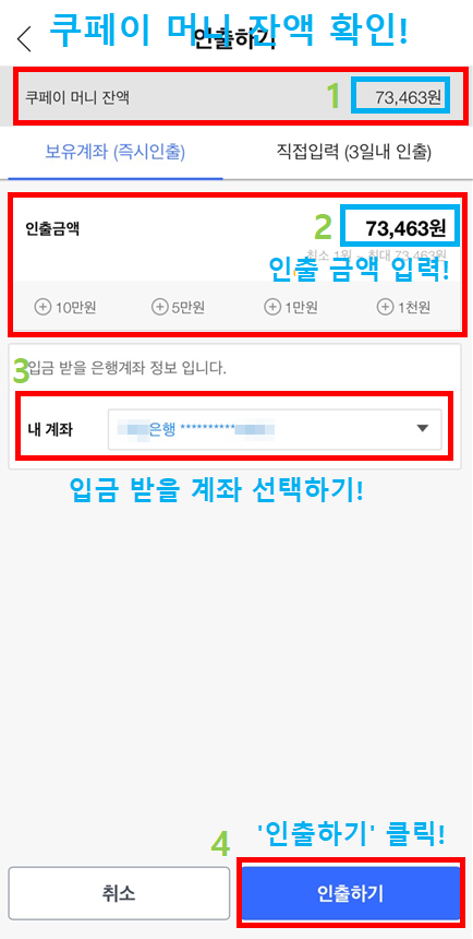 5. 위 사진에서 초록색 숫자 1번부터 4번까지 차례대로 확인 후 진행해주시면 됩니다! 쿠페이 머니 잔액 확인, 인출하고자 하는 금액 입력, 입금 받을 계좌 (본인 계좌) 선택 후 맨아래 '인출하기' 클릭!