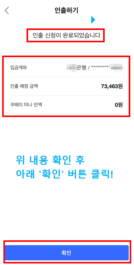 7. 위 화면에서 '인출 신청이 완료되었습니다'라는 문구 확인, 쿠페이 머니 잔액 확인을 해주시고 맨 아래 '확인' 버튼 클릭!