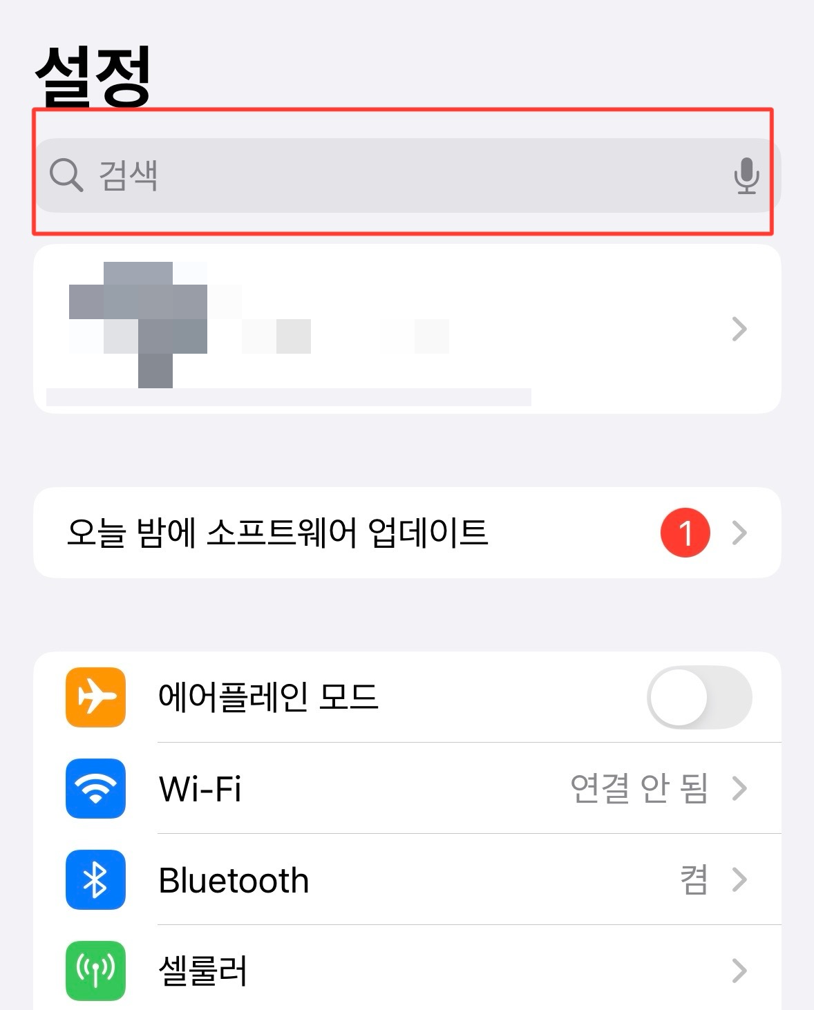2. '설정'으로 이동한 뒤에 사진에서 보이는 '검색' 창을 클릭해주세요!