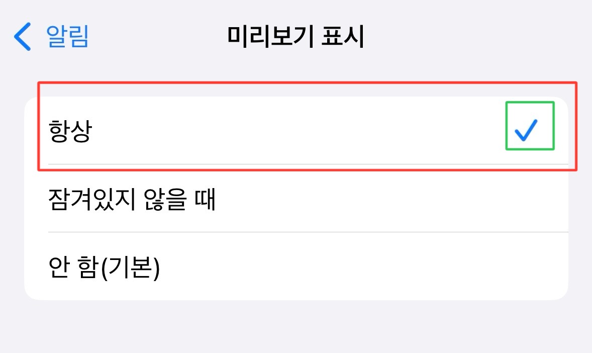 6. 카톡 메시지 미리보기 표시를 하고 싶다면 '항상'을 클릭 후 사진에서 보이는 초록색 네모칸에 '✅' 표시가 되어있으면 미리보기 표시가 켜져 있는 것입니다!