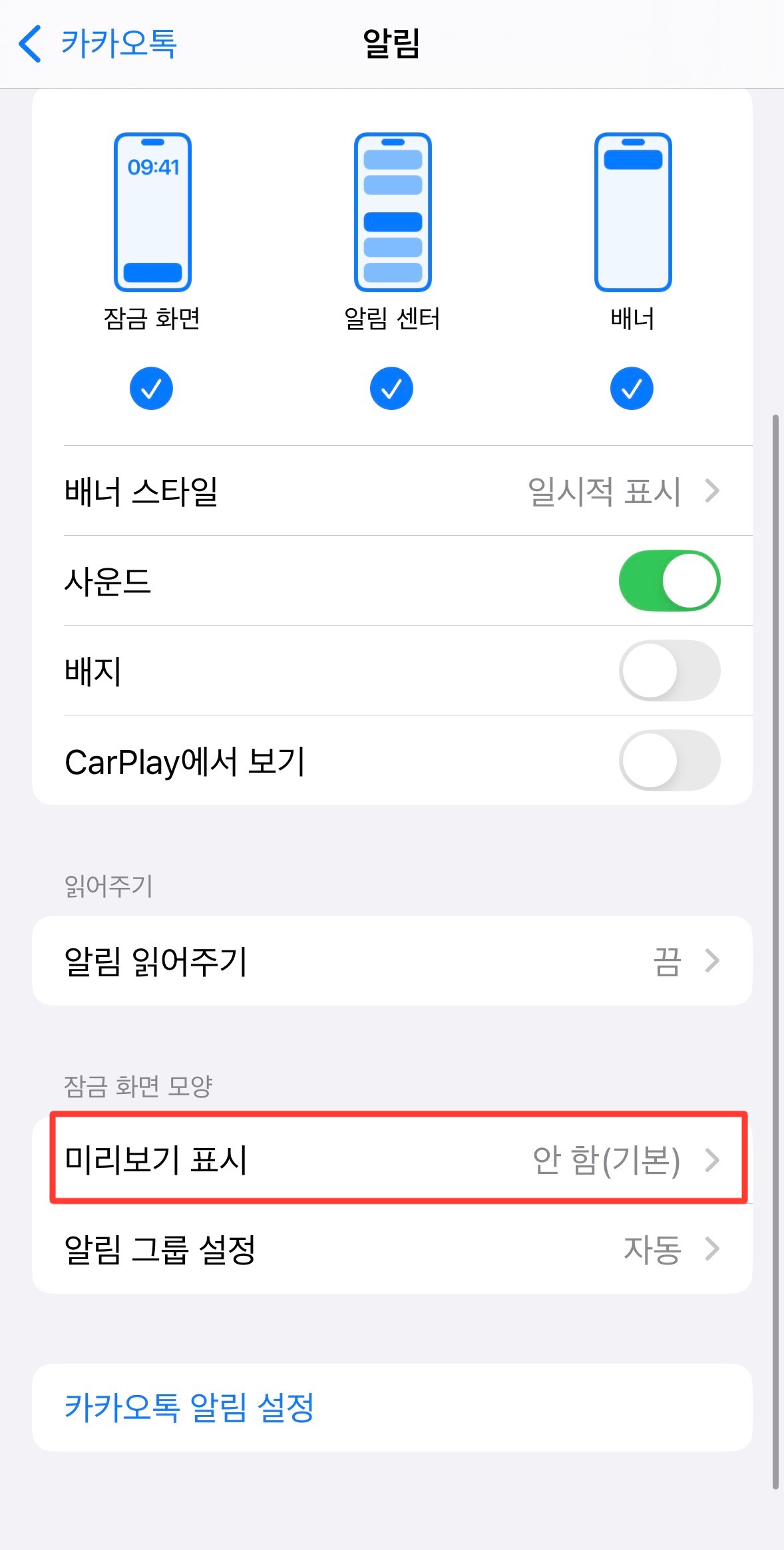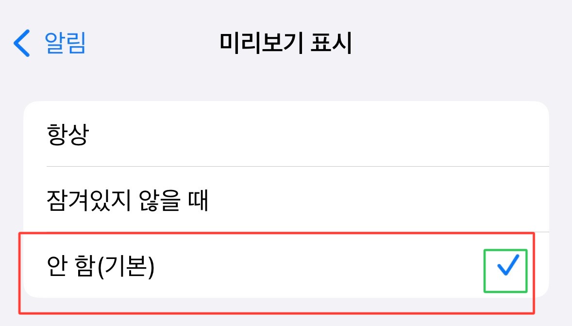 6. 카톡 메시지 미리보기 표시를 하고 싶다면 '항상'을 클릭 후 사진에서 보이는 초록색 네모칸에 '✅' 표시가 되어있으면 미리보기 표시가 켜져 있는 것입니다!