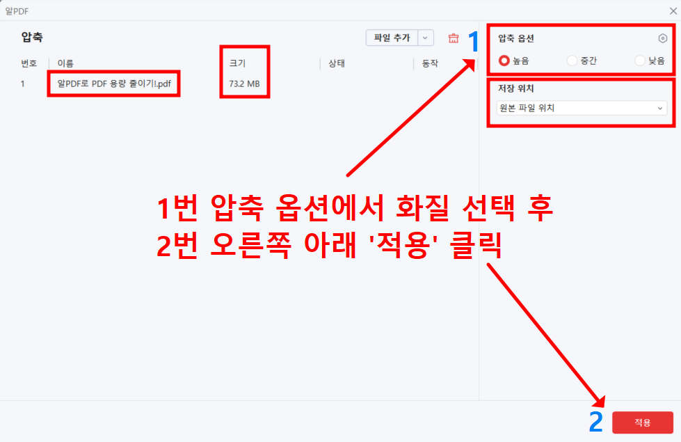 압축 옵션에서 원하는 품질 선택 후 오른쪽 아래 '적용'을 클릭합니다.