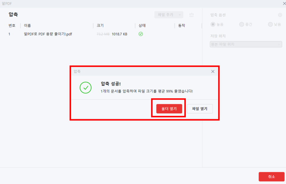 4. '압축 성공!' 문구 확인 후 '폴더 열기' 클릭!