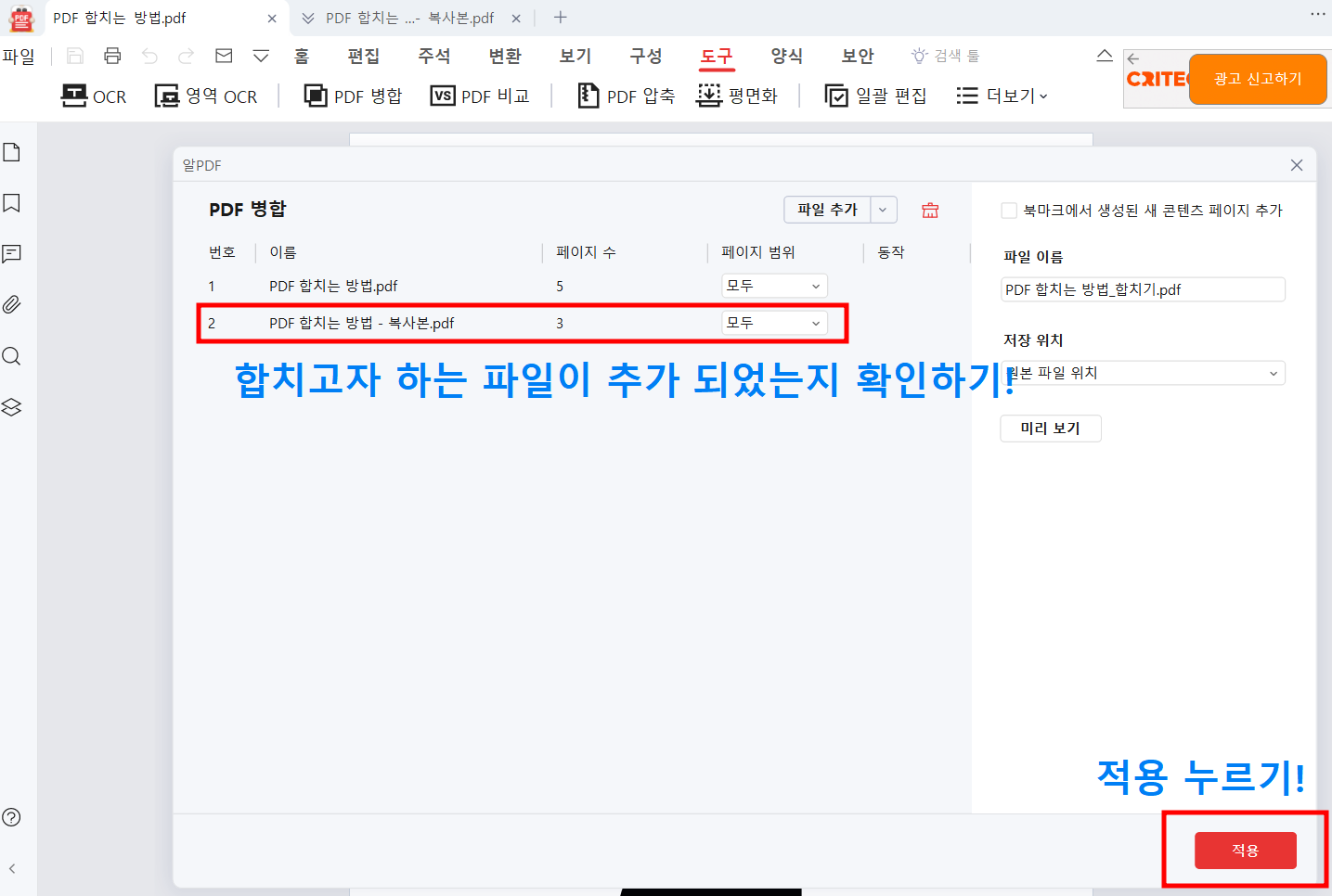 합치고자하는 파일이 추가 되었는지 확인 후 오른쪽 아래 '적용' 버튼을 눌러주세요!